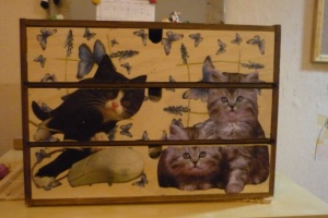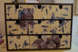 Затем был декупаж... Я уже показывала дизайн икеевских мини- комодиков, но покажу еще раз... Сейчас им до комплекта декорируется уже не мини, но тоже маленький комодик из той же Икеи, но он еще в работе...