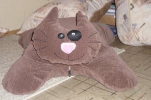 Однажды Оле захотелось сшить подушку для пола, поскольку на полу проходит немалая часть ее жизни... Но просто подушка- это неинтересно, и на свет появился Безумный кот... Потом ему в пару был сшит небольшой "котик" и- подарен подруге, так, что даже фото не осталось. А затем пришла пора мини- котиков... Родоначальник теперь живет у меня на работе, в компании с керамической Посей...