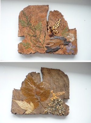 Маш, вроде- Безумный кот и коты- тапки были где-то в инете найдены, а вот мини- котики- все своя фантазия... Для Оли еще важно было подловить характерные особенности будущего владельца- ну, кроме родоначальника... Он делался как "проба пера", а как только был готов- я его себе выпросила... Ну, маме то ведь трудно отказать, тем более- я не наглею. У меня есть еще кой- какие Олины поделки, которые либо не в тему- таких очень много, на самом деле, либо просто не поддаются фотографированию. Есть вазочка "Моя семья", на ней с трех сторон три фото- сама Оля и- по обе стороны от нее- Нюсенька и Пося. Но на фото все сливается с фоном, не разглядеть. А вот еще одну работу мне хочется показать. На Алтае они проводили фестиваль на еще строящейся базе, и среди строительного хлама Оля подобрала тонкий срез дерева, высохший до состояния хрупкости- правда, в руки страшно взять было... Несколько ночей- и вот что получилось. Хоть и не в тему...