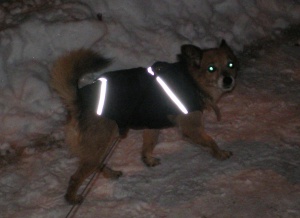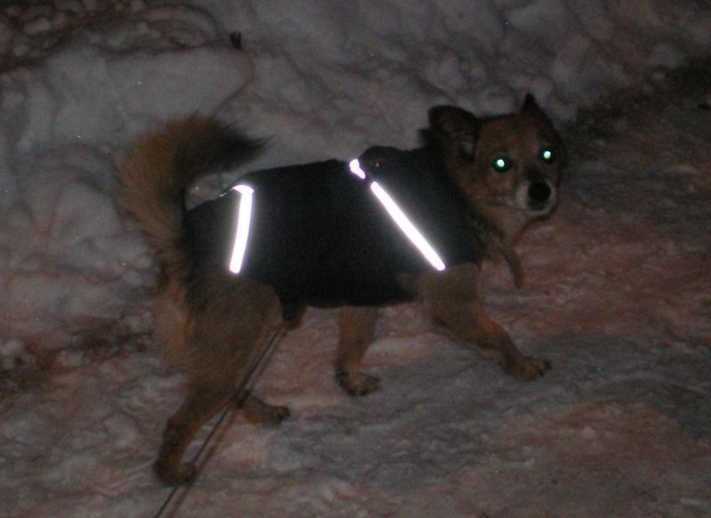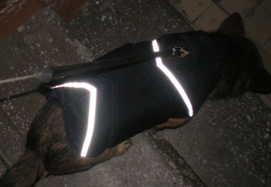 Огромное спасибо Марине (НеЯ)! Прогулка прошла просто на ура! Жилет сидел как влитой, совершенно не стеснял движений и очень хорошо грел (проверяла на прогулке -под жилетом тепло как в печке). Во время прогулки нам встретился полицейский патруль, они аж перестали разговаривать и в прямом смысле таращились на Фокса, я призадумалась, а потом поняла, что ЭТО сильно напоминает бронежилет! А от вспышки и фар Фоксик превращается в собаку Баскервилей