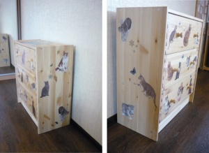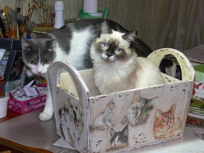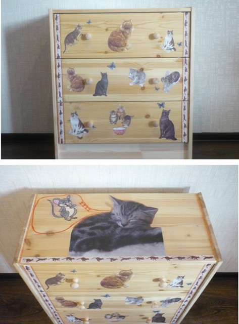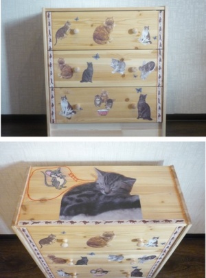 Кошки абстрактные, просто нахожу, что нравится. Делается в технике декупажа. В данном случае использовалась специальная бумага с рисунками для декупажа, в Леонардо покупались, там с разными рисунками есть. Ее истончать не надо. А вот на верхней плоскости- котенок из календаря и мышка из интернета скачаная- на обычную бумагу. Вот с ними возни побольше было. Бабочки и прочая мелочь- салфетки, опять же специальные, декупажнве. На миникомодики вообще шли киски с тетрадных обложек, довольно плотные. Сверху все лаком покрывается, получается здорово. А киски в ящики- да, очень даже пытаются пробраться. Стараюсь не допускать- потом от шерсти долго чиститься приходится.