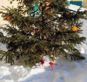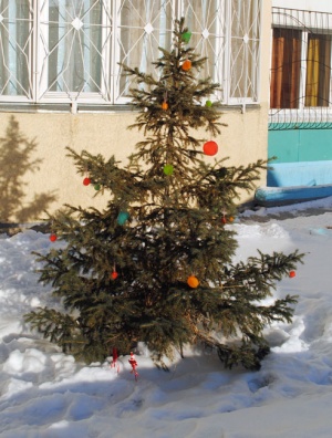 разводили в воде акварель в разной концентрации, наливали в формочки, запихивали верёвочки и выставляли на улицу) потом после сон.часа все шли на улицу и дружно наряжали ёлки)))