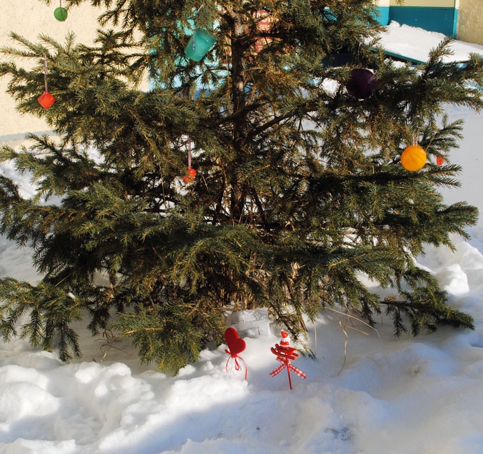 Сегодня увидела такую елочку. Сначала удивилась, почему же игрушки до сих пор никто не снял, а потом все стало ясно - игрушки из льда ))). Просто замечательная идея, можно наморозить в формочках любые фигурки (в том числе и животных) и развесить на уличной елке возле дома
