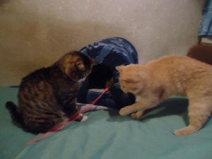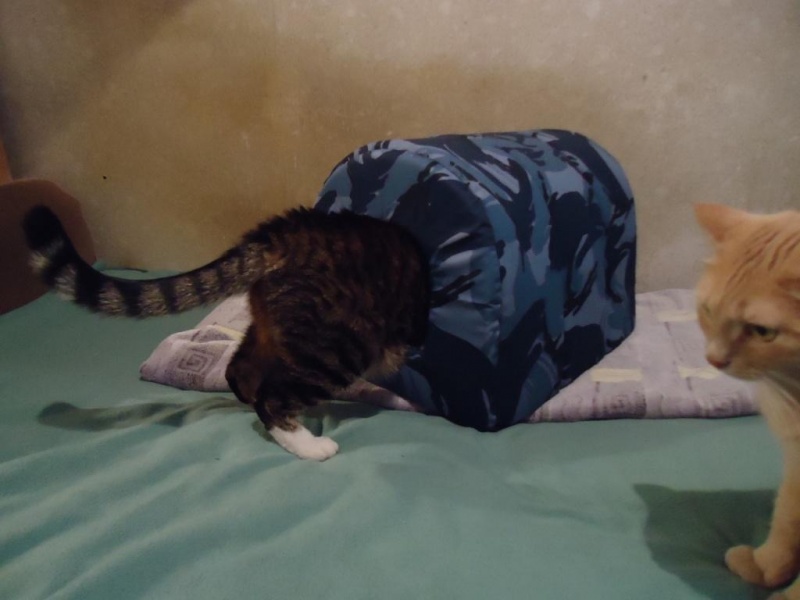 Сегодня за этим же занятием был замечен и Рыжий, хотя вчера воевал с Кузьмой, кто внутри домика спать будет... Все, теперь шью только лежанки