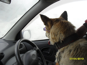 .Орудуя сосиской, мы без труда убедили Лису забраться на кресло и сесть. Первые минуты 2 собака просто терпела происходящее за-ради периодически выдаваемых кусков сосиски. А потом началось...