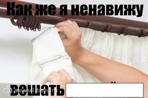 Лен, я вот терпеть не могу тесьму, которую для сборки к шторам пришивают, поэтому покупаю в Логосе металлические колечки, пришиваю их к шторкам. Они чудесно одеваются и снимаются с крюков. Ну и окна у меня 175 см в высоту, я 170 см. Следовательно, я спокойно встяю на подоконник и совершенно спокойно всё это вешаю. Вот в отцовской квартире, где окна 150, ужас-ужас!!!