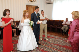 Я уже отписалась, что получила несколько фотографий нужного мне качества в "Комфото". Менеждер мне там поведал, что обычные фото в ГУТе корректирует машина, вот поэтому неудивительно, что у меня платье из белого стало желтоватым, платье свидетельницы из красного - коричневатым, а мамино из розового - оранжевым.