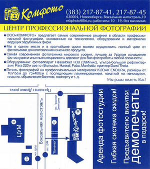 Ещё посоветую глянуть на "Комфото" - центр профессиональной фотографии, как они себя называют, на Вокзальной магистрали, 10, за "Бонанзой", "Асканией" (и что там ещё...). Я там не печатал, но зашёл туда на две минутки, поспрашивал немного, взял визитки, прайсик, и увиденное и прочитанное произвело самое приятное впечатление. Не знаю чем - наверное, серьёзным подходом к делу и отсутствием каких-то понтов, при том, что заявляют в визитке: "Самая современная фототехника мирового уровня, лучшее за Уралом оснащение фотостудии ... ". Но всё это на словах, печать не пришлось пока. В общем, отсканил визитку, прилагаю к посту. Есть они в "Дубль-ГИСе" (два телефона, е-мэйл), а сайта нет, как я понял. Печатают на (цитата) "профессиональных материалах Kodak Endura", потому подороже, чем обычно, но два месяца назад цены были то ли 7, то ли 10 руб за 10х15, т.к. были скидки на какое-то время. На дорогое сердцу любительское фото, вроде свадебного, можно потратиться, думаю.