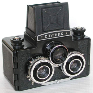 "Спутник является пока единственной стереоскопической камерой, выпускаемой нашей промышленностью. Это пленочная камера, заряжаемая катушечной пленкой и построенная по типу и на базе двухобъективный зеркальной камеры "Любитель". В аппарате установлены два рабочих объектива "Т-22", какие имеются на камере "Любитель", и такой же визирный объектив. Так же устроены видоискатель камеры и два синхронно действующих затвора.
