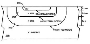 "Sony запатентовала CMOS сенсор, который работает по аналогии с датчиком Foveon. Принципом, как показано на рисунке, является несколько чувствительных слоев в каждом из R цветов (красный), G (зеленый), B (синий), используя принцип, что каждый основной цвет имеет различную длину волны и несколько иной глубиной проникновения в кремний.