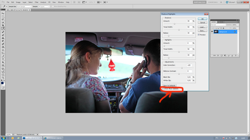 В Shadows/Highlights внизу крыжик Show More Options включает расширенный режим из трех групп регуляторов