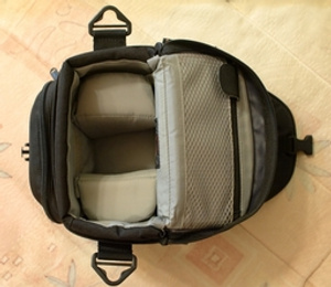 Наплечный ремень, чехол от дождя (закреплен в отдельном кармане, цвет серый), 2 боковых сетчатых кармана, карманы на молнии - 2 наружных и 1 внутренний, отделение под фотокамеру имеет две переставляемые перегородки, возможно крепление на поясной ремень.