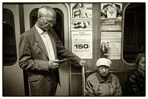 2-ая: зачем-то поллица у тети справа обрезал (на кой полумеры это ж не луна?), зачем-то глаза бабушке закрыл, брак, нет? а если это такая сюжетная задумка, типа: дедушка читает, а бабушка спит от скуки, так как ей читать нечего, то она тяжеловато читается из поллица тети справа и опять же, потому что поленился чуть присесть, так сказать, чтобы "расставить более четкие композицонные акценты", а в данном случае несмтря на наличие персонажей, фотка больше про "кладбище рекламы" на стене вагона!