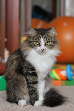 Ну и по мелочам что-то. Посмотрите, всего пять шагов, но они позволили изменить ваш снимок в лучшую сторону. Теперь это не просто какая-то кошка, сидящая среди цветных шариков. Теперь это серьезная вдумчивая личность, иначе о ней не скажешь.