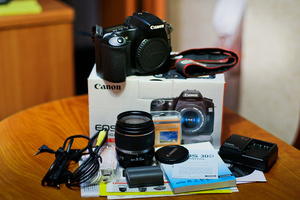 1) Canon 30D kit(c штатным объективом 18-55) в хорошем состоянии. Комплект полный-все провода, крышки, зарядка, документы, родной аккумулятор, бонусом защитный фильтр.