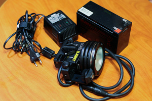 3) видеосвет Lowel ID-light в хорошем состоянии. Установлена лампа на 100w (применяются автомобильные галогеновые лампы) Переделано под питание от аккумуляторов от ИПБ. В комплекте аккумулятор, зарядное устройство и запасная лампа на 50w.
