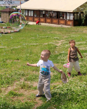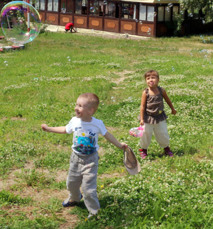 В части водоема и поля - мне кажется они не отвлекают... Это просто сравнительно симпатичное место где мальчик с девочкой играют.... Не было бы у меня тяги к "пространствам и водоемам" - я бы не задумывался на предмет кадрирования... Но тут смущает немного что вроде и симпатичное место, но эмоционально более слабое... Т.е. как по по мне - вырезать мальчика, девочку, пузырьки и вообще на левый фон аля заставка виндоуса с полями-холмами была... А так, мне кажется, недотягивает обстановка до главных героев...