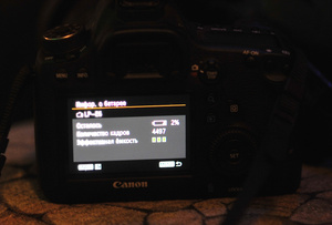 LP-E6, возраст год и 4 месяца, была заряжена за две недели до сьемки и при установке в аппарат показала емкость 94%. Сьемка в течение дня с периодическим просмотром кадров