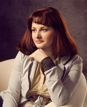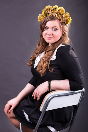 Полным женщинам с широким лицом не очень идут длинные волосы, спускающиеся вниз. Желательно было открыть шею, а волосы собрать в верхней части прически. Тогда бы лицо не казалось таким пышным. А сейчас вы создали о ней впечатление как о полной девушке с короткой шеей. А вот тему ее женского достоинства и не раскрыли.