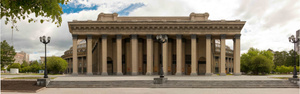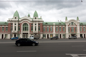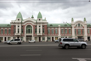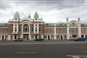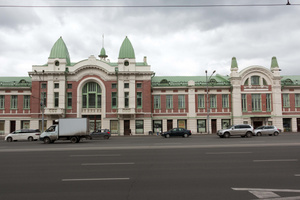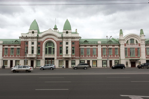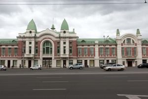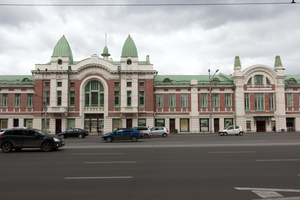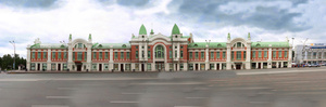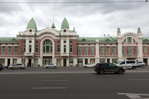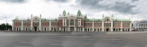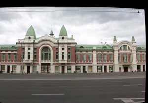 Интересный рисунок искажения перспективы получился. Чем дальше объект от камеры - тем он шире. Цилиндр зала выглядит таким огромным, что кажется что это не просто большой театр Сибири, а самый большой театр мира. И еще момент: боковые стены вестибюля (прямые) видны одновременно с двух сторон, словно здание построено как трапеция. Но это не бросается в глаза. Все равно снимок получился симпатичным.