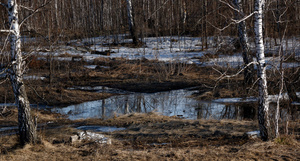 воды тонкий слой, под ней лед с вмерзшими листьями и сверху дождик весенний моросящий.. западно-сибирская эклектика)
