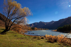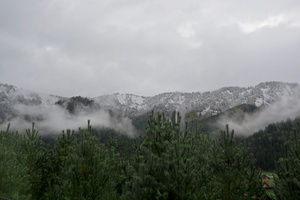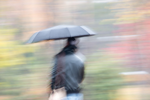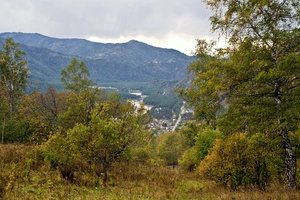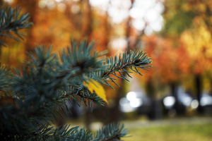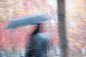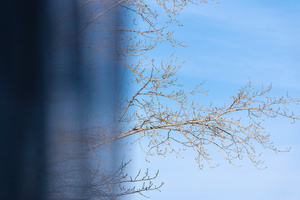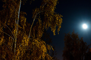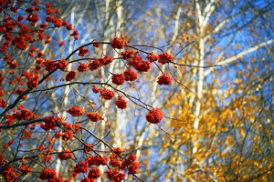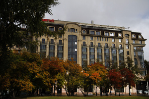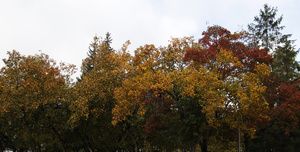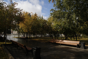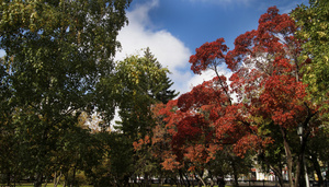 На фотографии с Мариоттом я мысленно убрала здание — и картинка сложилась: серебристо-пасмурное осеннее небо и ряд деревьев, как будто уходящий, идущий... Слева чуть-чуть, как намек, — огромные темно-зеленые режущие воздух ветки, а потом сразу, резко, ярко под ними — маленькие округлые кроны, багровая листва...