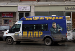 Слоган ЛДПР и синий цвет рождают ассоциации с небольшими такими пластиковыми кабинками...