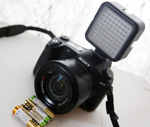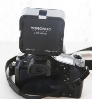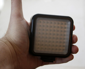У меня вот такого типа видеосвет, только диодов чуть больше ну и мощность 14 Вт. И диммер есть. Понятно, что свет рассеянный, а не как фара автомобиля, но для фото и видео такой и нужен. Маленький, компактный, легкий. Ставится на камеру или фотоаппарат.