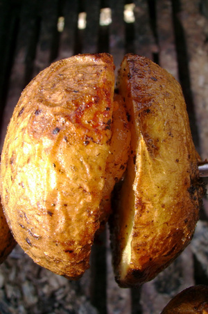 Печеная картошка, разрезанная пополам с чем то вкусненьким внутри...