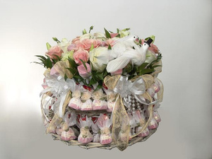 Если нужно прямо срочно, советую самому купить конфет, фруктов и т.д. и со всем этим прийти в любой цветочный салон (можно распечатать и прихватить с собой вот эту фотографию, чтобы не объяснять на пальцах, чего хотите : )