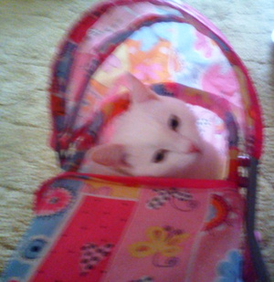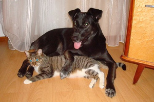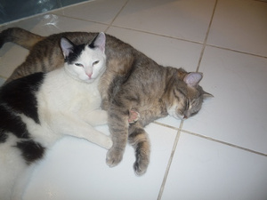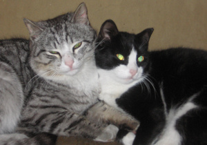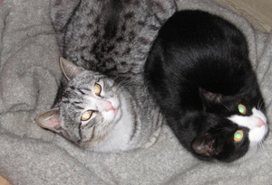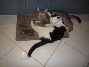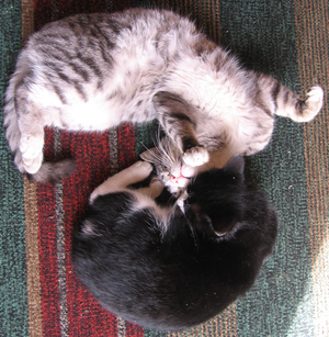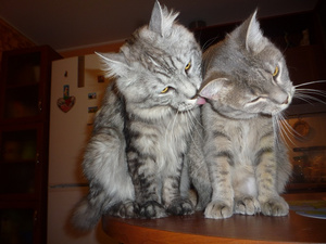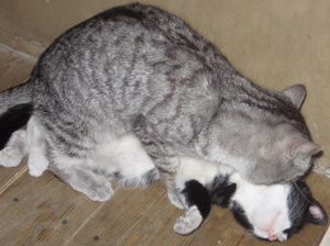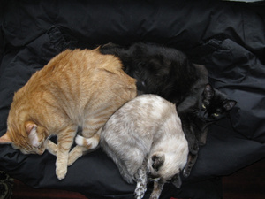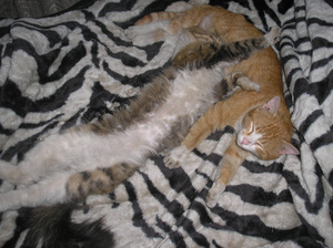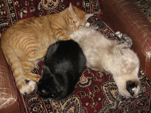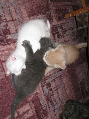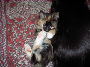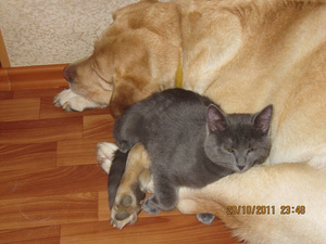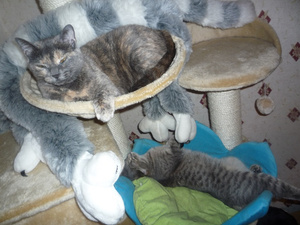 Не предполагала, что сей эгоист сможет не просто ужиться с котятами, но и фактически усыновить их -- тем не менее, это так.