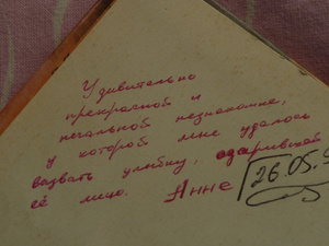 ) - даже мужу ни когда не показывала. книга от мужчины встретивший меня в метро. -- книгу купил себе видимо- подарил мне. с подписью. А когда стала в возрасте;- был один комплимент который сфотографировался на всю жизнь. один пожилой человек с болезнью паркинсона (я его видела не однократно ранее) глядя в глаза сказал- Мне хочется перед Вами выпрямить спину- но мне это не удастся - просто поверьте на слово.