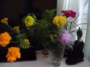 Вот только что пока с Тоськой (собакой) гуляла. Сосед- дудулечка. Сам сад под окном выращивает- Говорит ;имею право, такой женщине как вам подарить хорошее настроение и свои цветы.- и прям с клумбы хвать их и мне. (что-то на меня дедушки заглядываются