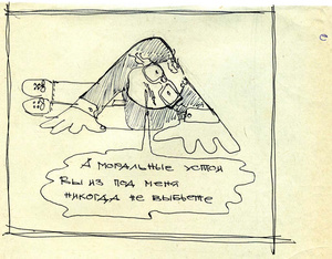 Суслов красит домики на макете, размешивает кисточкой краску в баночке. Подбегает Леопольдовна и начинает верещать, что он ничего не сделал, а надо было сделать то и это. Суслов меланхолично слушает, слушает Леопольдовну, а потом поднимает руку и замазывает кисточкой стекла ее очков.
