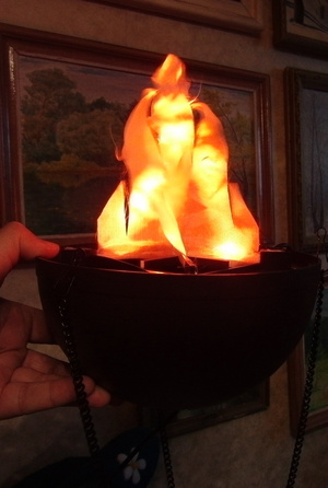 Сделали бы сами такой факел. Ничего сложного. Фото же есть. Вентилятор плоский, плюс лампочки синие и красные. Ну и ткань легкую, чтобы вентилятор ее поднять мог. Поставили в чашу и грейтесь на здоровье. Светодиоды лучше не брать, у них свет слабый. Лампы для этого лучше подходят.