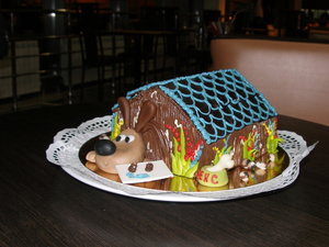 Да-да, вот этот торт мы разрезали и съели. Было очень вкусно. В пропитке-креме орешки, крыша дачи шоколадная. Сам торт бисквитный.