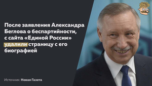 Вчера Беглов назвал себя беспартийным, хотя уже много лет член партии «Единая Россия», а сегодня упоминания о нем удалили с сайта партии. Это как проштрафившихся сотрудников полиции увольняют задним числом, так видимо и тут, но тут проштрафилась сама партия превратившись в токсичный бэкграунд для своих членов. Еще немного и на следующих дебатах Беглов скажет, что не только беспартийный, но и давно сопереживает Алексею Навальному!