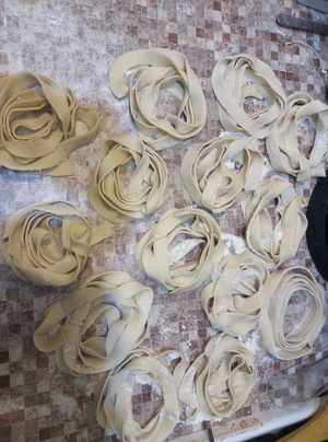 понятия не имею... я их в гнезда скрутила, обжарила лук, ножки белого гриба замороженные, куриное филе, разложила гнезда эти и -залила сливками. под крышкой 10 минут и готово... как только, так хочу именно на яйцах поставить. сегодня сделала самые простые мука и вода