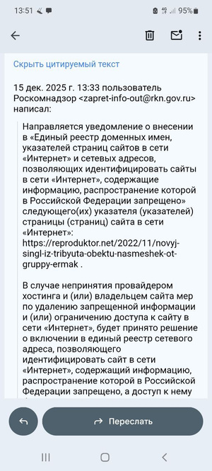 Приехали хотя никуда и не ехали. Роскомнадзор направил нам претензию на новостную статью о трибьюте Рикошету 2022 года. Оказывается, песня "Брат Ураган" теперь запрещена к распространению в РФ. Похоже, скоро всё инфопространство сведётся к одному-двум персонажам.