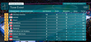 По итогам всех видов программы в общем зачете первое место заняла сборная США (69 баллов), второй стала Япония (68), третьей - Италия (60). На четвертом месте расположилась Грузия (56 баллов), на пятом — Канада (54 балла).