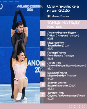В фигурном катании завершились ритм‑танцы. Французский танцевальный дуэт Лоранс Фурнье Бодри/Гийом Сизерон захватил лидерство, набрав 90,18 баллов. На втором месте американцы Мэдисон Чок/Эван Бэйтс (89,72), на третьей позиции канадцы Пайпер Гиллес/Поль Пуарье (86,18). Выступающие за Грузию Диана Дэвис и Глеб Смолкин с 77,15 балла располагаются на 13‑м месте.