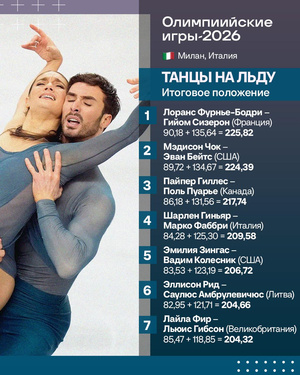В танцах на льду выиграли французы Лоранс Фурнье‑Бодри и Гийом Сизерон. Второе место заняли американцы Мэдисон Чок и Эван Бэйтс. Тройку замкнули канадцы Пайпер Гиллес и Поль Пуарье.