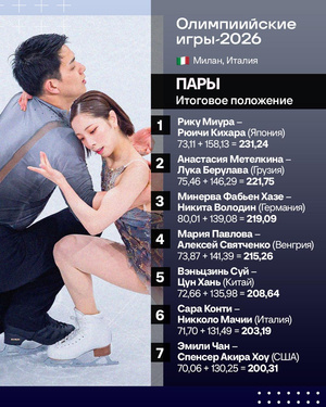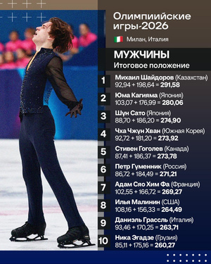 Американский фигурист Илья Малинин показал лучший результат в короткой программе мужчин на Олимпийских играх‑2026 в Италии. Малинин получил от судей 108,16 очка, исполнив тройной аксель, четверной флип и фирменное сальто. Второе место у представителя Японии Юмы Кагиямы (103,07). На третьей позиции француз Адам Сяо Хим Фа (102,55). Далее расположились итальянец Даниэль Грассль (93,46), представляющий Казахстан Михаил Шайдоров (92,94) и кореец Чха Чжун Хван (92,72). Эти шестеро фигуристов выступят в последней разминке произвольных прокатов.