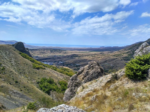 Дороги подшаманили, по сравнению с прошлым годом - от Симферополя до Грушевки через Белогорск прям формула-1, зеркало: 130 км/ч даже не заметно. Потом уходит на Феодосию в том же виде, а поворот в Судак лата на зарплате, да с трамплинами. Ещё походу на год работы.