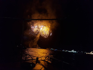 На салют в артбухте выходили в море на катере к барже.