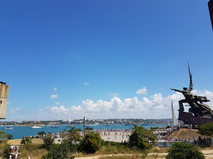 На салют в артбухте выходили в море на катере к барже. Ездили на 35 батарею. Она восстановлена, отстроен огромный мемориал и полностью финансируется частным лицом. Его принцип - "Память не должна продаваться!" - поэтому и там вход бесплатный. Экскурсии заходят каждые 20 минут и длится посещение 1,5 часа, но ждать экскурсии 2-3 часа, так как много желающих. Впрочем как и во всех остальных музеях. Поэтому в 12 взяли бесплатные билеты на 17 часов и спокойно поехали в Херсонес, а к 17 вернулись обратно. Так как тусоваться в ожидании на 42-градусной жаре то еще удовольствие даже с пивом)))