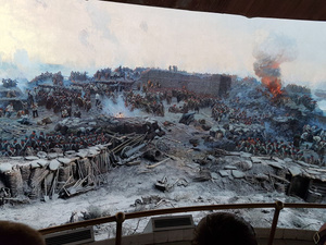 Ездили на 35 батарею. Она восстановлена, отстроен огромный мемориал и полностью финансируется частным лицом. Его принцип - "Память не должна продаваться!" - поэтому и там вход бесплатный. Экскурсии заходят каждые 20 минут и длится посещение 1,5 часа, но ждать экскурсии 2-3 часа, так как много желающих. Впрочем как и во всех остальных музеях. Поэтому в 12 взяли бесплатные билеты на 17 часов и спокойно поехали в Херсонес, а к 17 вернулись обратно. Так как тусоваться в ожидании на 42-градусной жаре то еще удовольствие даже с пивом)))