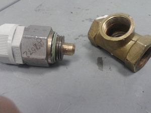 Вобщем дело шло и на блоке управления самоваром уже начала маячить температура. Датчик обычный целиндрический диаметром 10 мм и высотой 15 мм бронзовый никак нехотелось делать накладным. Непридумав ничего другого взял обычный бронзовый вентиль на полдюйма открутил буксу, так как для моей задумки нужно только тело. Взял штуцер с внутренним диаметром на 9 мм отпилил по длине и нарезал в нем резьбу на 10 шаг 1.0. На датчике соответственно нарезал наружнюю резьбу и вкрутил через фум в штуцер. Штуцер ввернул в тело вентиля. Для вывода кабеля ввернул кабельный фитинг. Гермнтичность обеспечена. проверял.