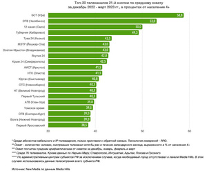 Топ-20 региональных телеканалов 21-й кнопки по среднему охвату телесмотрения за декабрь 2022 - март 2023 гг., в процентах от населения 4+
