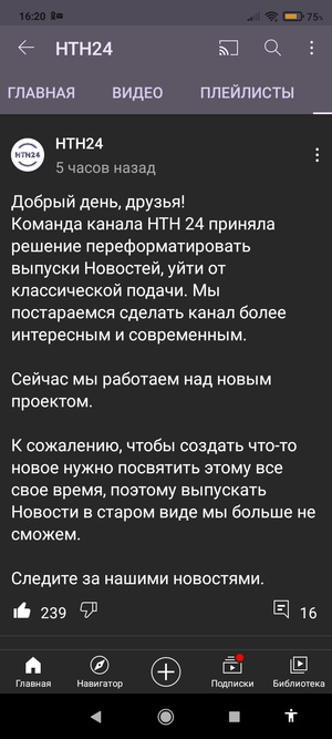 Вчера 25ноября2021 на Ютуб канале(странице) нтн24 не вышел выпуск новостей в первые за полгода как они временные интернет сми